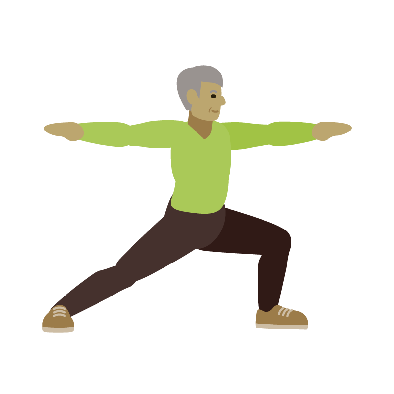 Standing: On a non-slippery surface, like a yoga mat or carpet, bring your feet about hip-width apart. Breathe in and step your right foot two or three feet behind you. Do whatever distance feels comfortable without straining. Angle your back foot to about 45 degrees, or find a comfortable angle. If you are on a yoga mat, point your toes toward the top left corner of the mat. Bend into your front leg so that your knee is in line with your ankle or a little behind it. Find a position that feels right. When you are ready, engage your core so that your torso is upright. Extend your left arm forward and your right arm back. Relax your shoulders and breathe here for a few rounds of breath. On your last exhale, step the back foot forward to meet the front. You may hold onto the wall or nearby table to steady yourself while you do this. When you are ready, repeat the steps for the other side.