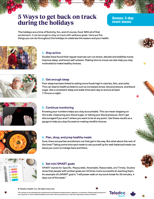 5 Ways to Get Back on Track During the Holidays Get the Guide Related articles A Strategy For Staying On Track Over the Holidays Tips for a Healthy Thanksgiving Healthier Green Bean Casserole Your Guide to Pool Exercise Four Healthy Canned Foods Return to top