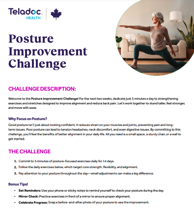 For the next 14 days, dedicate 5 minutes daily to posture-strengthening exercises to reduce back pain and improve alignment.