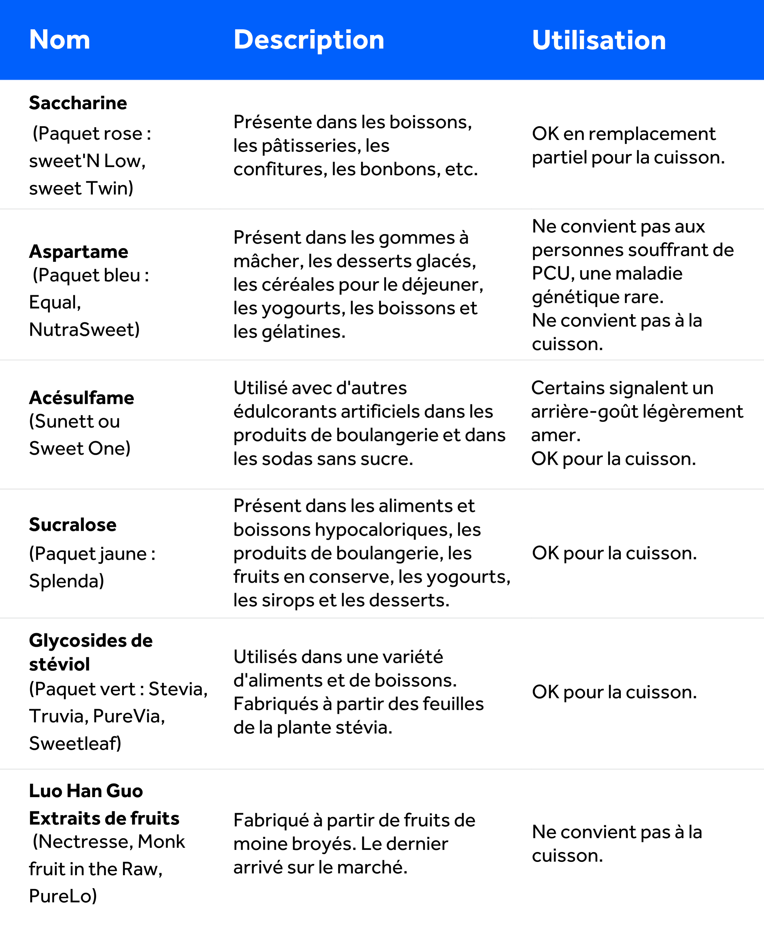 Les édulcorants artificiels approuvés par Santé Canada sont considérés comme sûrs. Ces édulcorants sont beaucoup plus sucrés que le sucre de table. Cela signifie que vous n'avez besoin que d'une petite quantité pour atteindre le même niveau de douceur.