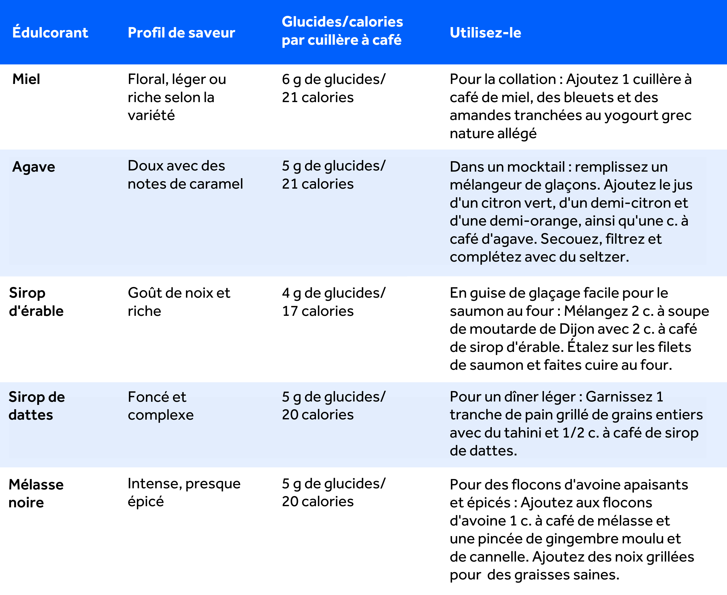 La bonne nouvelle : vous pouvez profiter des édulcorants comme le miel, le sirop d'érable et bien d'autres, avec modération. Par rapport au sucre blanc, ces édulcorants offrent des saveurs plus intenses. Cela signifie qu'une petite quantité peut aller très loin. L'utilisation d'une simple touche d'édulcorants naturels peut aider à améliorer les aliments entiers sans avoir un impact important sur votre taux de sucre dans le sang.