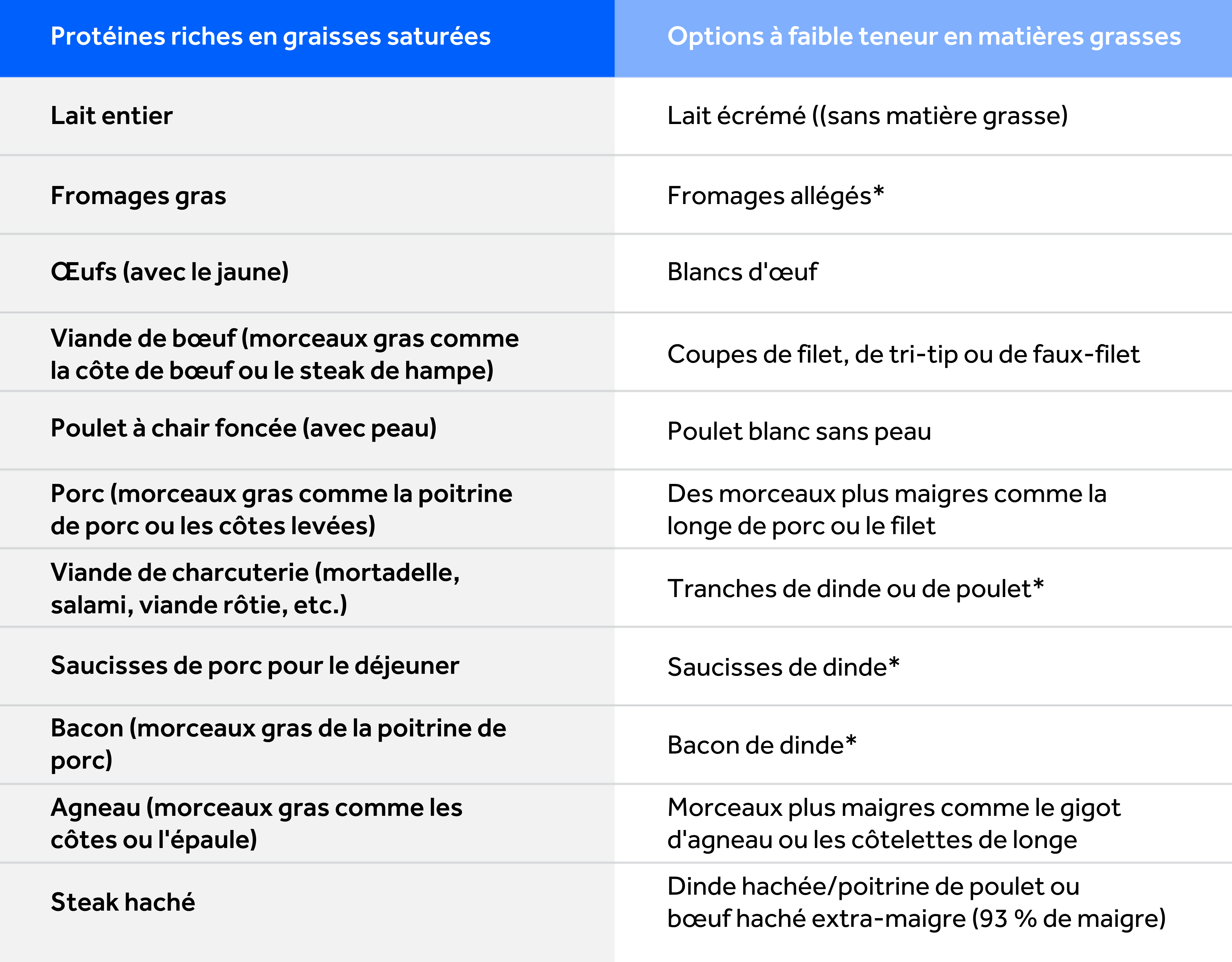 Vous pouvez toujours savourer de délicieuses options de protéines et respecter vos objectifs de santé! Essayez quelques-uns de ces échanges simples pour profiter de protéines savoureuses qui sont naturellement moins caloriques et moins riches en graisses saturées.