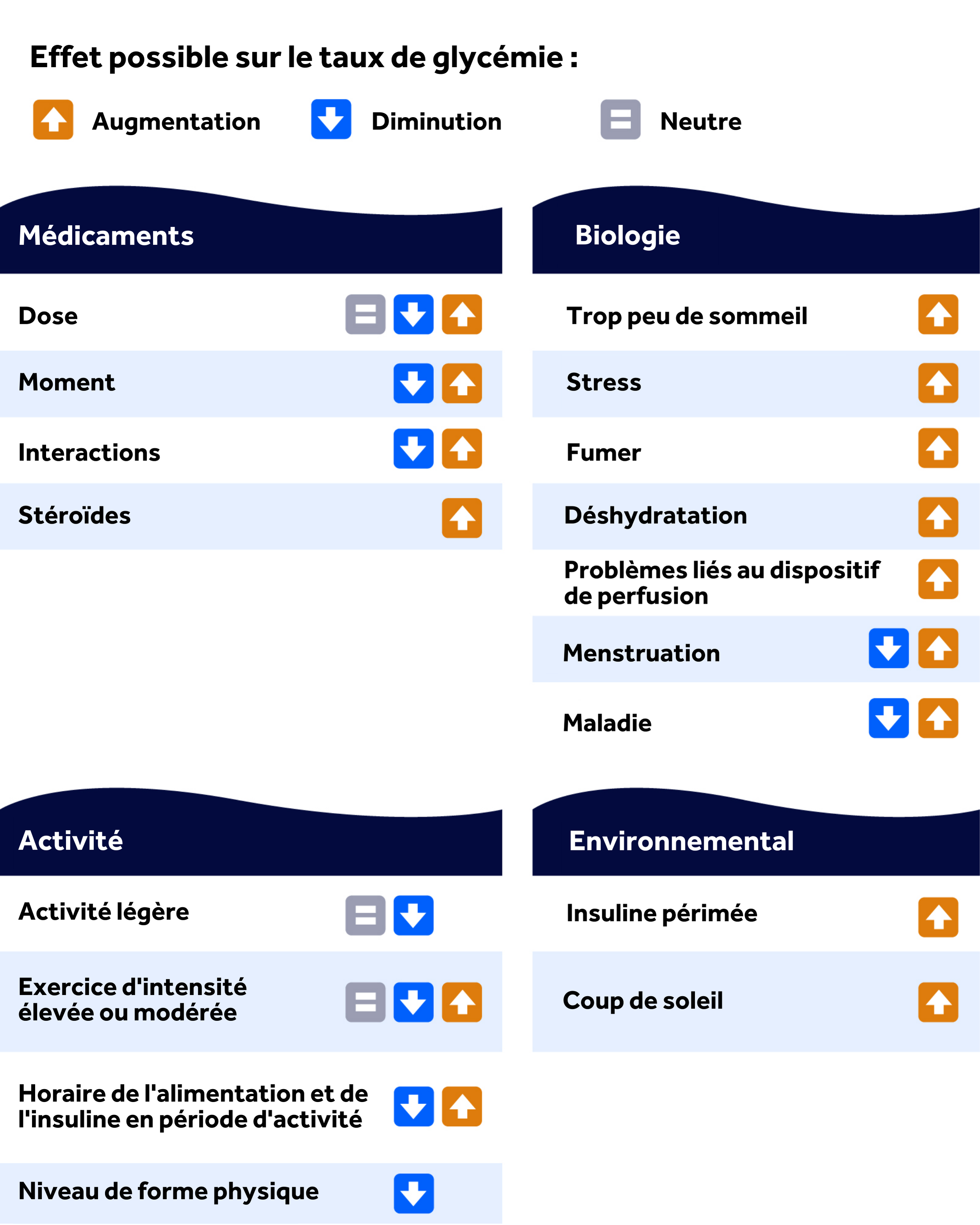 La nourriture peut faire en sorte que votre glycémie soit élevée, ou elle peut aider à la maintenir stable. Il existe de nombreux autres facteurs qui peuvent également modifier vos taux. Le fait d'avoir accès à vos taux 24 heures sur 24 et 7 jours sur 7 grâce à votre dispositif de SCG peut vous aider à mettre les choses en perspective. Voici quelques raisons qui peuvent expliquer vos tendances.
