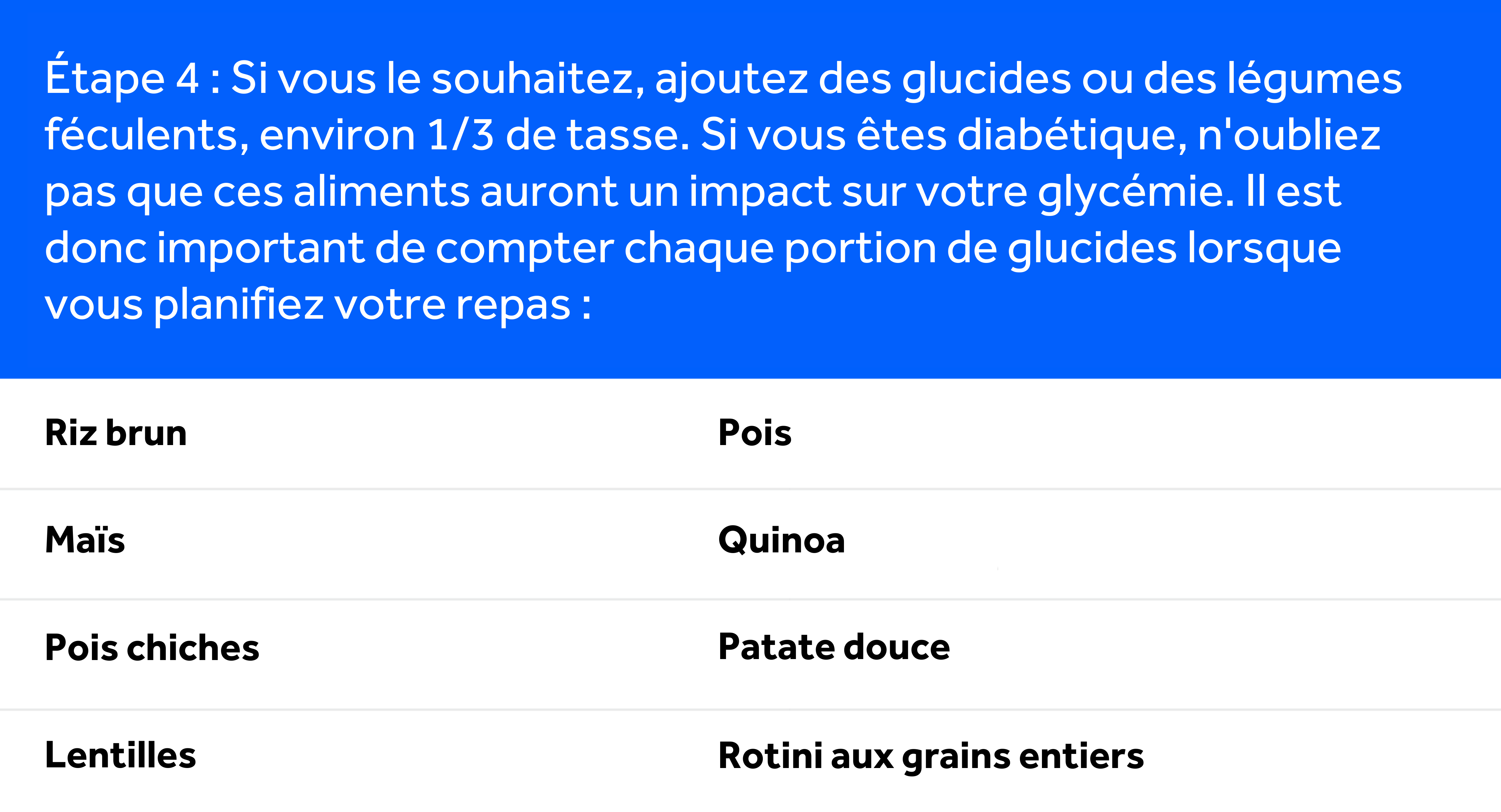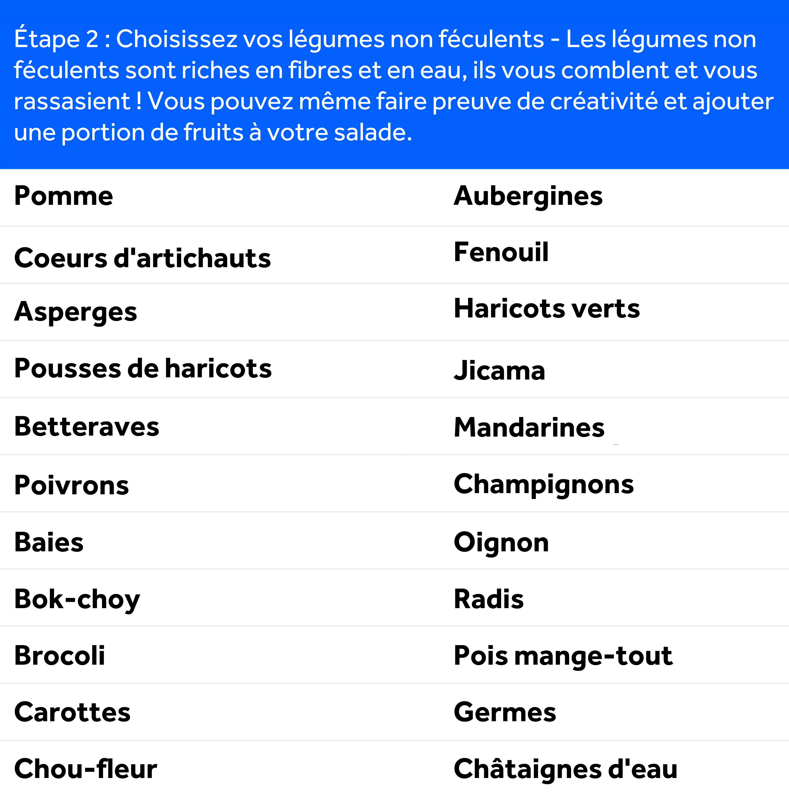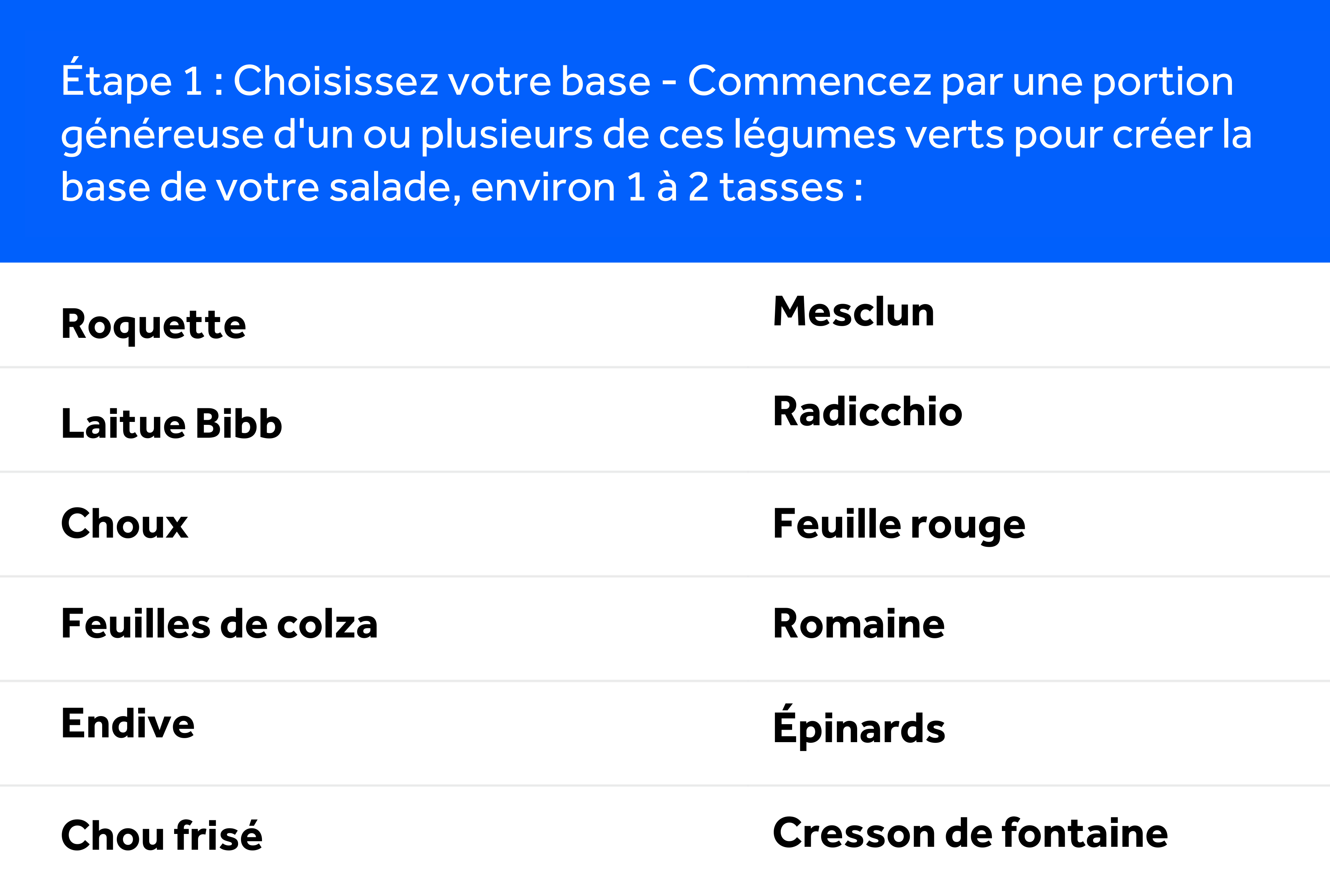 Suivez ce guide simple, étape par étape, pour créer une salade saine, équilibrée et délicieuse à chaque fois! Veuillez noter que si vous êtes diabétique, il est important de faire attention à la teneur totale en glucides de votre repas pour mieux gérer votre glycémie et la maintenir à un bon niveau.