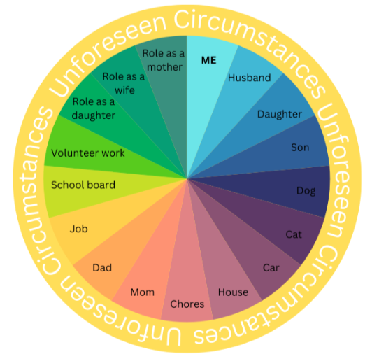 Utilisez une assiette en papier ou un cercle dessiné pour diviser le cercle en différentes sections, chaque section correspondant à une responsabilité dans votre vie. L'essentiel est d'évaluer si vous êtes submergé(e) et si vous prenez le temps de vous accorder de l'espace. Sur le bord extérieur de l'assiette ou du cercle, vous pouvez inscrire « Circonstances imprévues », car elles font partie de la vie et échappent à notre contrôle.