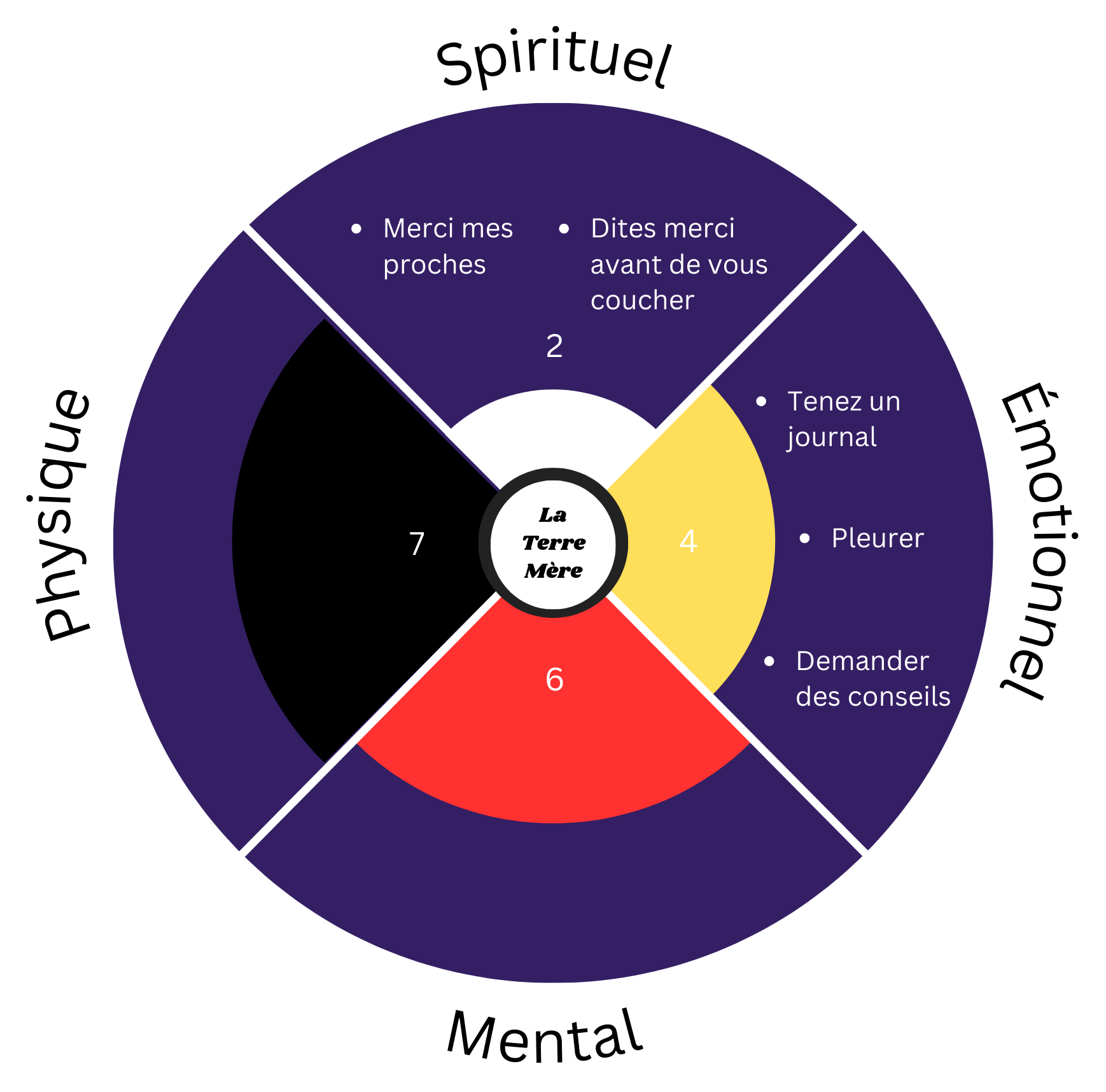 La roue du bien-être comprend quatre quadrants distincts qui composent notre bien-être : émotionnel, mental, physique et spirituel. Chaque section est tout aussi importante et nécessaire pour le bien-être de chacun. Il est nécessaire que vous vous assuriez que toutes les sections soient équilibrées. Si elles ne le sont pas, ne paniquez pas. Cela signifie simplement qu'il y a du travail à faire. Commençons par évaluer votre bien-être.
