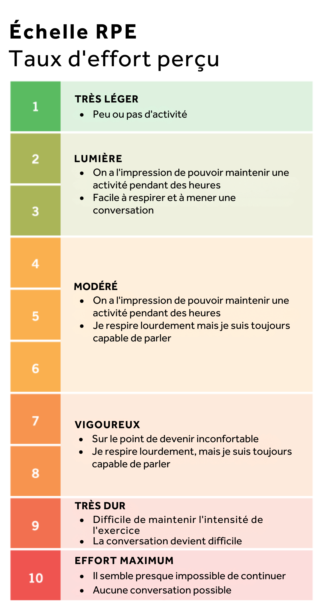 Nous allons vous simplifier la tâche! Ce tableau vous permettra d'évaluer votre échelle de perception de l'effort (EPE). Servez-vous de cette échelle de 1 à 10 pour suivre votre intensité en estimant votre niveau d’effort selon le schéma ci-dessous :