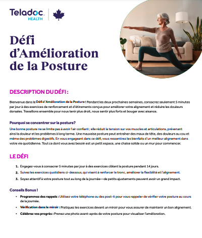 Pendant les 14 prochains jours, consacrez 5 minutes chaque jour à des exercices de renforcement de la posture pour réduire les douleurs dorsales et améliorer l'alignement.