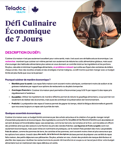 Ce défi de 7 jours vous invite à cuisiner chez vous et à éviter de manger à l'extérieur. Cela ne se contente pas seulement de réduire les coûts alimentaires globaux, mais encourage également des habitudes alimentaires plus saines en vous offrant un contrôle total sur les ingrédients et les tailles des portions.