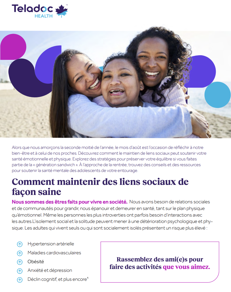 Infolettre d'août 2025 Télécharger l'infolettre L'infolettre de ce mois-ci comprend : Comment maintenir des liens sociaux de façon saine Étapes pour prendre soin de vous tout en prenant soin des autre Façons de soutenir la santé mentale des adolescents Articles associés Infolettre de juillet 2025 Infolettre de septembre 2025 Décortiquer le cardio Infolettre de novembre 2025 La santé des femmes et les soins virtuels Retour en haut